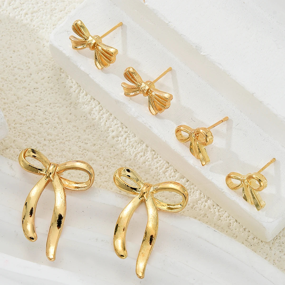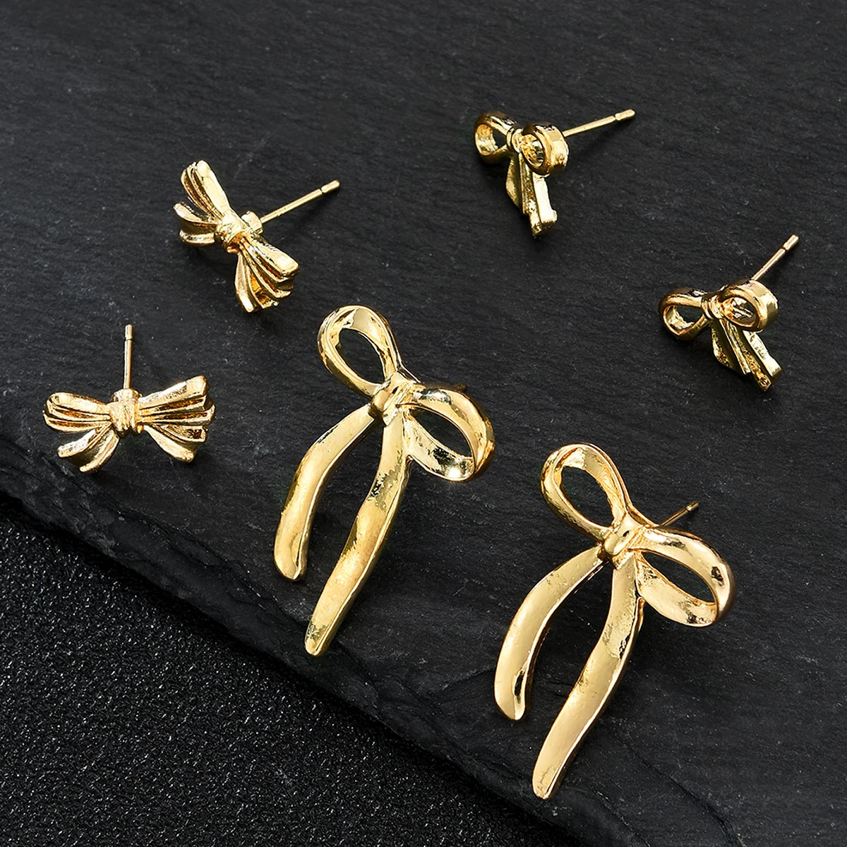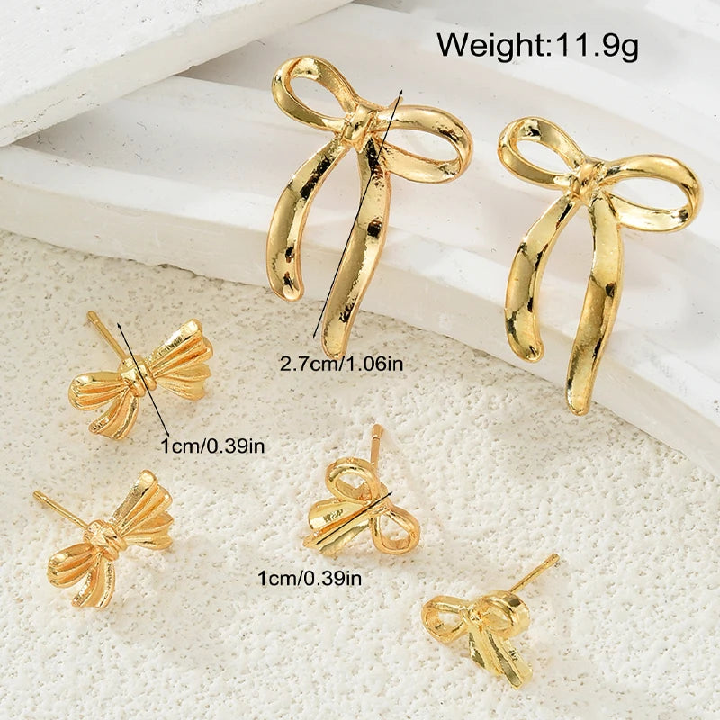 Elevate your look with the Luxoria Golden Bow Earrings Set. This 6-piece collection features gold-tone bowknot stud earrings that are cute, waterproof, and lightweight. Perfect for daily wear, parties, or gifting, these earrings add a stylish and versatile touch to any outfit.